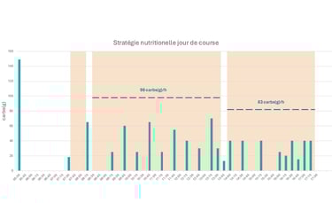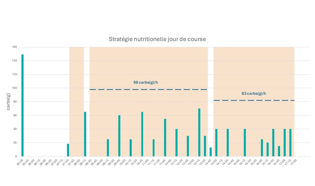 La moyenne des triathlètes professionnels vise environ 90 g de glucides par heure le jour J. Attention, pour des amateurs comme nous, viser 75g/h sera déjà très bien.