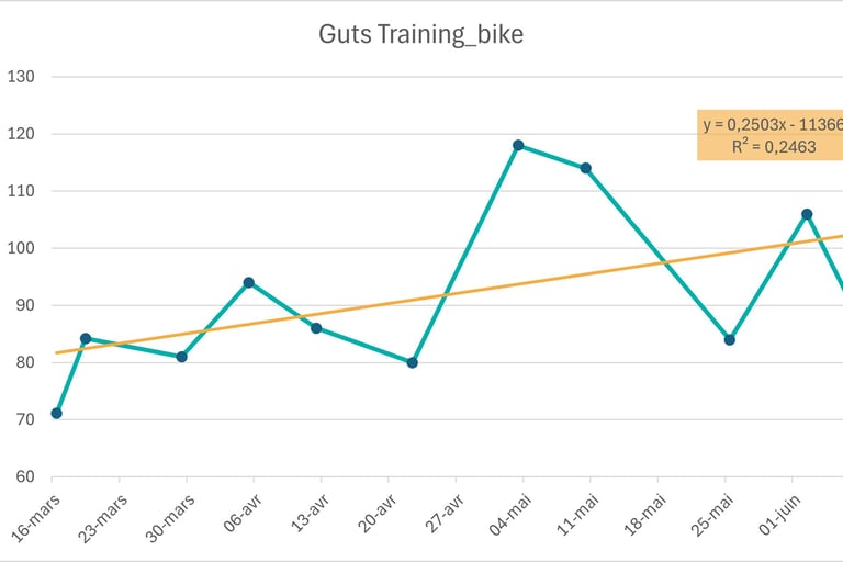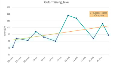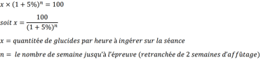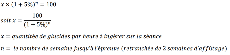 Gros mangeur, complètement stupide et encore jeune, je suis parti de mon but à atteindre, 100g/h, la limite physiologique que le système digestif peut absorber sans saturer étant de 90g /h (actuellement, car la science évolue rapidement à ce sujet) et que je tolérais bien de me nourrir sur le vélo. Puis j’ai appliqué la formule suivante en visant une augmentation de ce ratio de 5%/semaine (une augmentation douce lorsque PRECISION conseil 10%/semaine sur 2 mois).