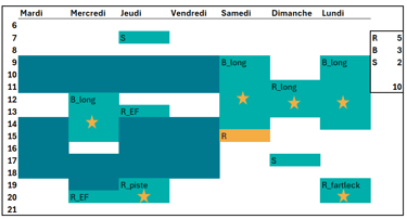 On se prépare à notre objectif, les séances les plus importantes deviennent les sorties longues et on garde des rappels pour ne pas perdre les qualités précédemment ou douloureusement développées. Il est stratégique d'avoir des journées off et des journées très actives.