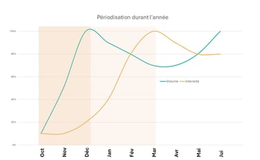 Evolution du volume et de l'intensité selon les 3 phases d'entraînement
